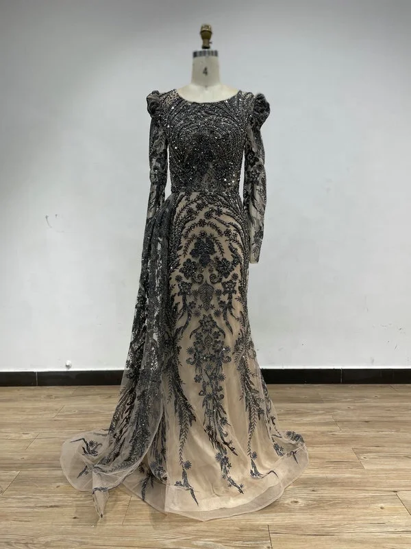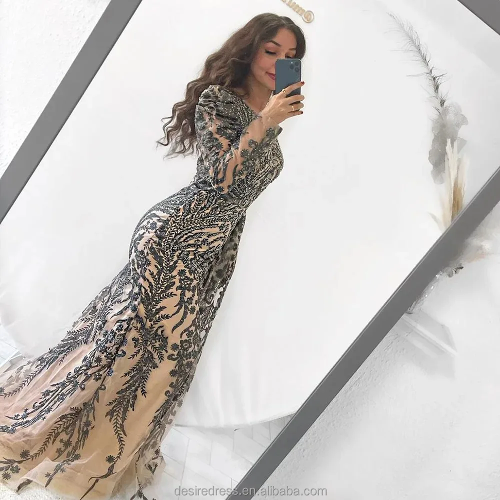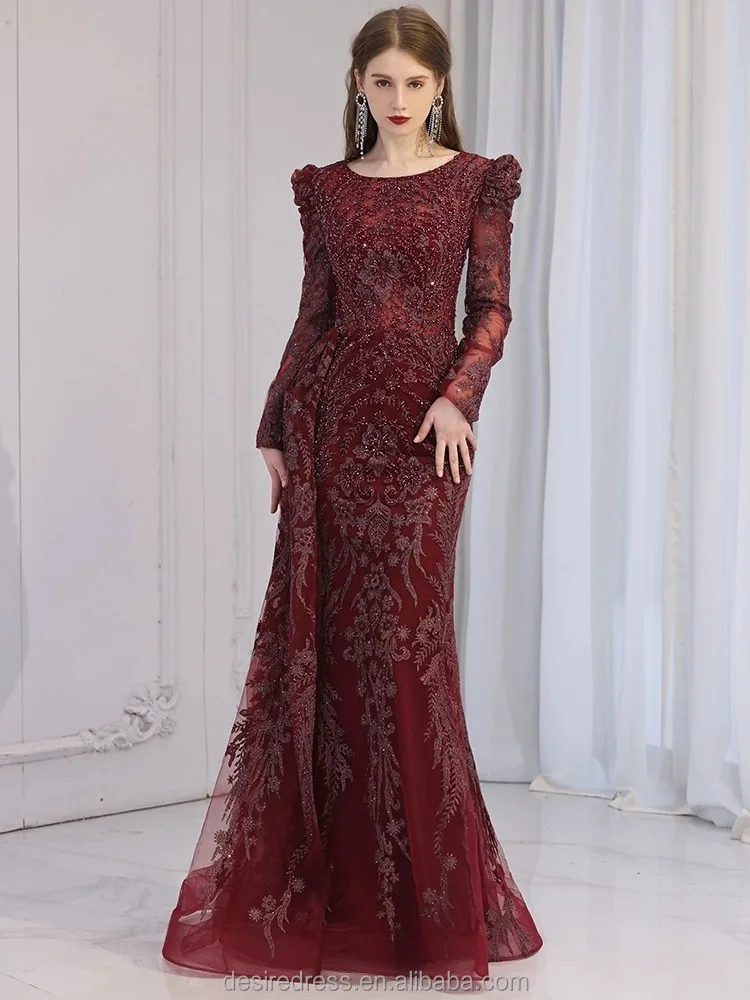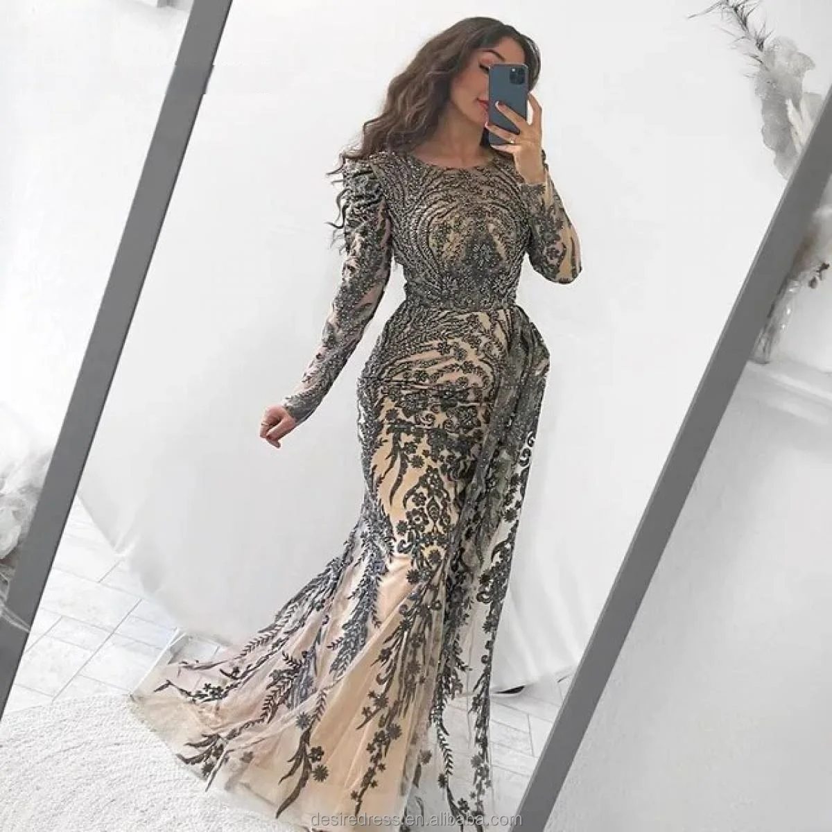 DWS2414 Vintage Dubai Scoop Neck Long Sleeve Evening Dresses Autumn Embroidered Beads Prom Dresses for Banquet Wedding Plus Size